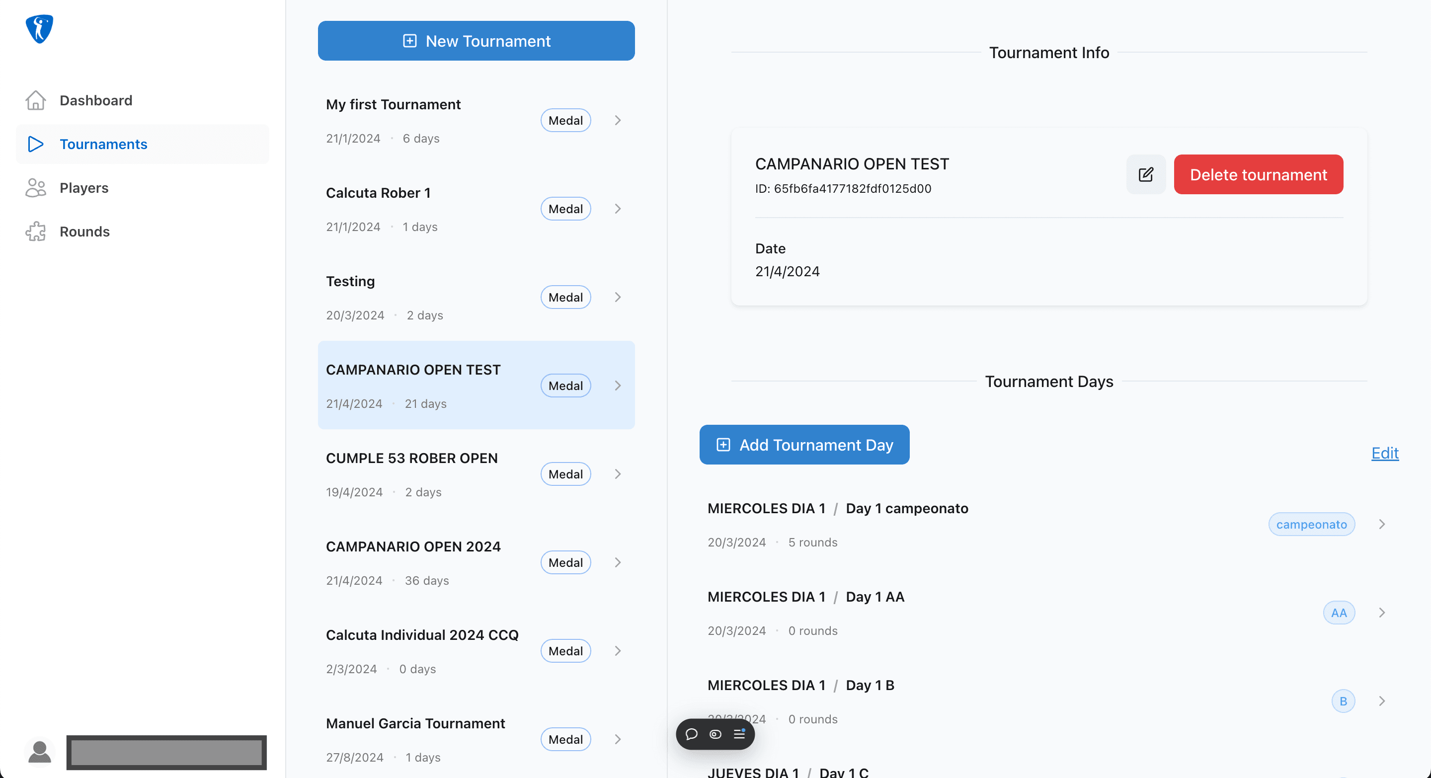 This is where the tournament is created and managed. You can create and assign players to tournaments, each player is then assigned to certain rounds so that they can modify and track their own scorecards through the app.